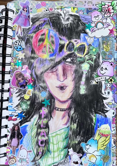 BAG: My crossbody bag is a gray bag that has a prominent rainbow peace sign in the center of it with white stars on the back with black stars + splots and gray swirls way behind. There's a seamless white fleur de lis pattern going on on the front and back. I got this bag from a yard sale for 17.00, I don't know who made the bag. It is also currently on eBay if you're interested to buy (i think you can just reverse search my bag using the images below) with most of the listings $30. There is also a green handkerchief(?) knotted in both straps that has a total of, currently, 5 pins and 3 hair clips on the left and 1 on the right.